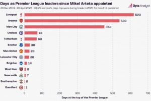 自2019年12月上任以来,阿尔特塔麾下的阿森纳在英超榜首的天数为539天,仅次于620天的利物浦。不过,利物浦在积分榜上领跑的天数包含了2020年因疫情导致联赛停摆的接近100天。