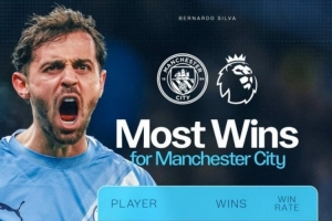 本场比赛B席首发出场,他也以215场胜利成为曼城队史英超胜场数最多的球员,具体榜单如下: