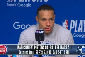 24直播网4月28日讯 NBA季后赛首轮,魔术94-88活塞,大比分3-1领先,赛后德斯蒙德·贝恩接受了媒体采访,以下为采访全文。