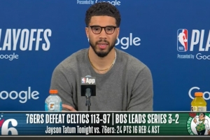 24直播网4月29日讯 NBA季后赛,凯尔特人97-113不敌76人,总比分3-2领先,绿军球星塔图姆赛后接受了媒体采访,以下为采访全文。