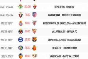 24直播网4月21日讯 西甲官方公布了第36轮赛程安排,马竞、巴萨和皇马将分别在北京时间5月13日、14日和15日凌晨出战。