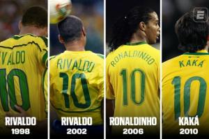 24直播网04月29日讯 ESPN巴西版今日盘点了近几届世界杯巴西队身穿10号球衣的球员,其中近3届都是内马尔,里瓦尔多、罗纳尔迪尼奥和卡卡在列。
