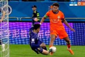 24直播网04月21日讯 泰山vs津门虎补时阶段,杨帆亮鞋底连球带人放倒克雷桑,吃到黄牌。