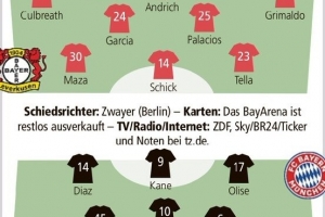24直播网4月22日讯 勒沃库森将在本轮德国杯半决赛坐镇主场迎战拜仁,《踢球者》预测了双方首发阵容。