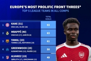 本赛季三叉戟进球榜:拜仁93球断崖领跑、皇萨列二三,枪手仅第13
